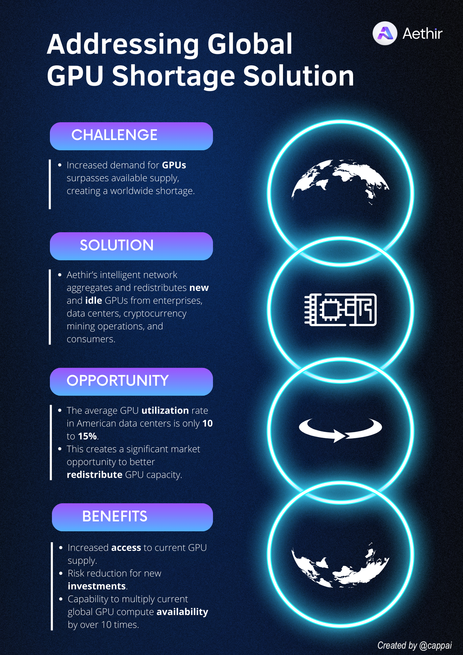 Aethir ofrece una infraestructura revolucionaria de computación en nube que cambia los paradigmas convencionales de propiedad y uso de GPU. Utilizando modelos descentralizados, proporciona recursos escalables y competitivos a una gran variedad de industrias en todo el mundo. Al optimizar el uso de las GPU y fomentar la propiedad descentralizada, Aethir democratiza el acceso a la potencia computacional avanzada. Su marco de trabajo distribuido mejora la fiabilidad y la capacidad de recuperación, reduciendo la dependencia de proveedores centralizados en la nube. El enfoque de Aethir en la reasignación de los recursos no utilizados promueve las oportunidades económicas, centrándose en las pequeñas y medianas empresas.